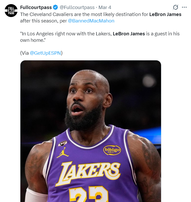 根据ESPN记者麦克梅纳明的说法,在本赛季结束后,詹姆斯最可能加盟的球队是克利夫兰骑士队。勒布朗在湖人的处境就是湖人的副驾驶都坐不下了,因为副驾驶是里夫斯的位置,詹姆斯已经被挤到后座了。